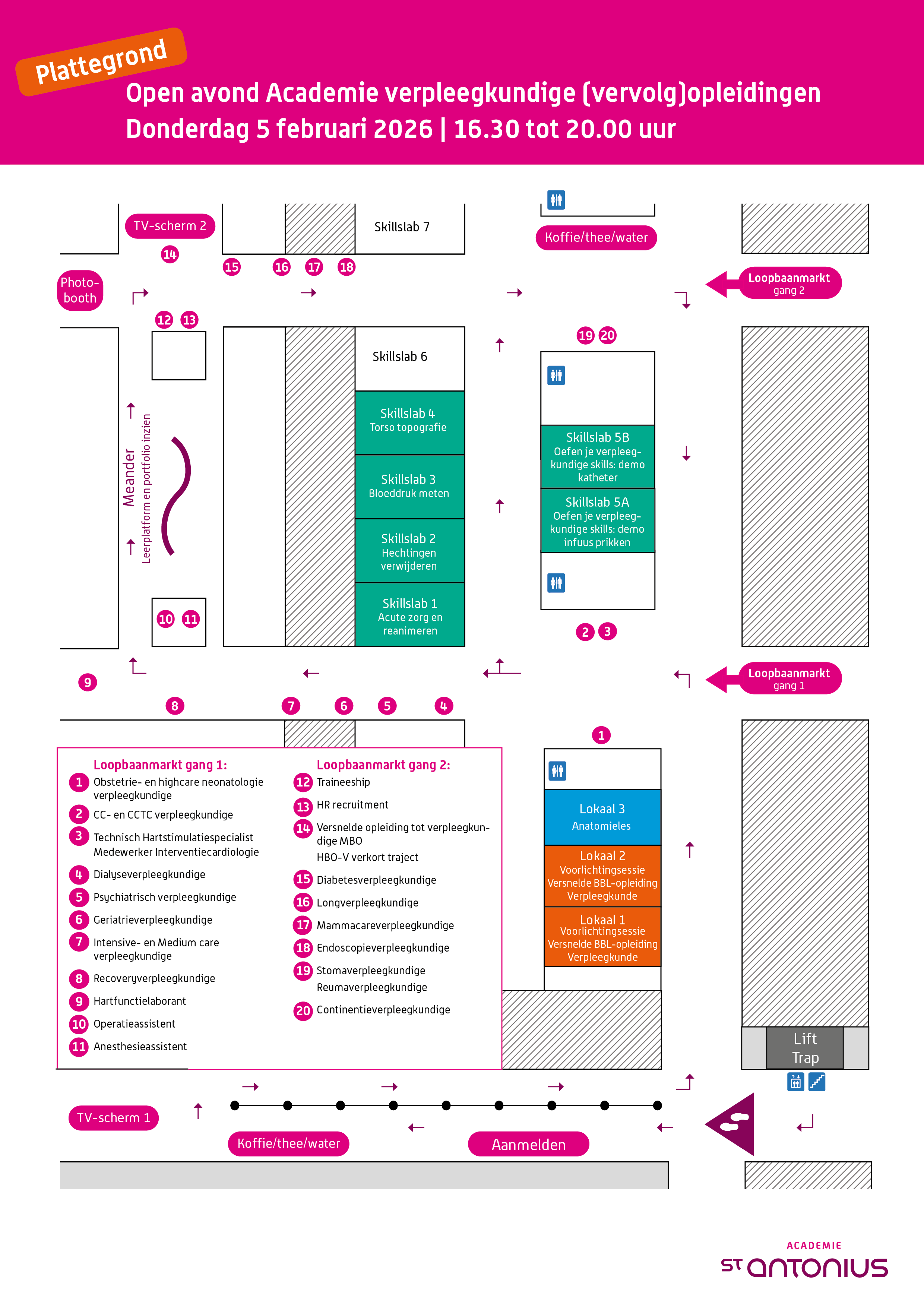 Tijdens de Open avond zijn collega's van verschillende afdelingen uit het St. Antonius Ziekenhuis aanwezig. Zij vertellen meer over hun afdeling, werk en de verschillende opleidingsmogelijkheden. Op de plattegrond zie je welke afdelingen meewerken.
